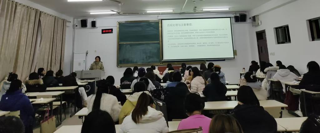 各班级班会紧扣全国大学英语四六级考试纪律要求,聚焦三大核心要点开展针对性教育:一是深化诚信理念培育,辅导员结合学术诚信与个人品德养成,向学生阐释诚信应考的重要意义,引导大家树立“以诚信为荣、以作弊为耻”的应考观念,自觉维护考试公平公正;二是强化违纪警示教育,通过解读《国家教育考试违规处理办法》核心条款,结合近年高校全国大学英语六级考试作弊、代考等典型案例,详细说明违纪行为对学业、学籍及个人征信的严重影响,筑牢思想敬畏防线;三是明确物品携带规范,逐一列明手机、智能手表、无线耳机等违禁物品清单,重点提醒学生提前备齐准考证、身份证、2B铅笔、橡皮等必备材料,熟悉考场入场安检流程,避免因物品问题影响考试。