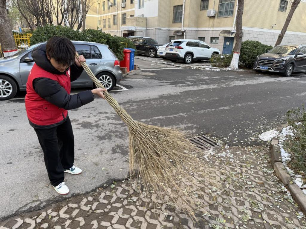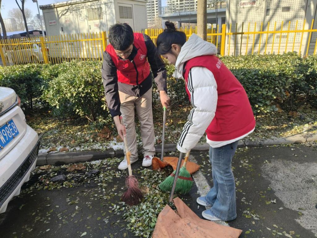 活动现场,志愿者们身着红色志愿马甲,手持大扫帚、铁耙、垃圾夹等工具,分工协作投入到环境整治中。有的志愿者挥动着大扫帚,仔细清扫社区道路上的落叶与杂物;有的两两配合,用垃圾夹将绿化带里的落叶、纸屑逐一清理装袋;还有的拿着铁耙,把草坪中堆积的枯枝败叶归拢清运。尽管冬日寒风凛冽,但志愿者们热情高涨,忙碌的身影成为社区里一道亮眼的风景线。