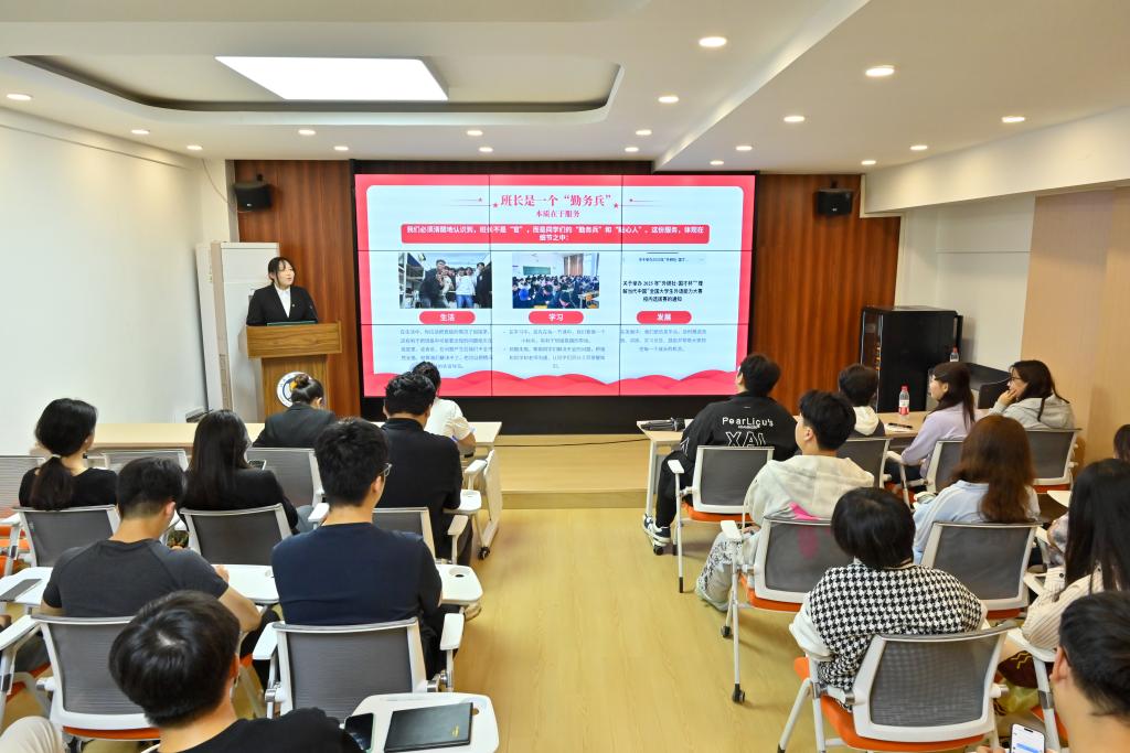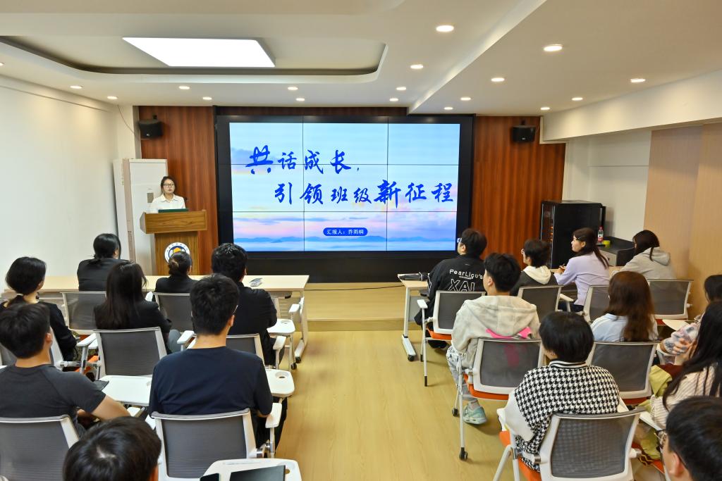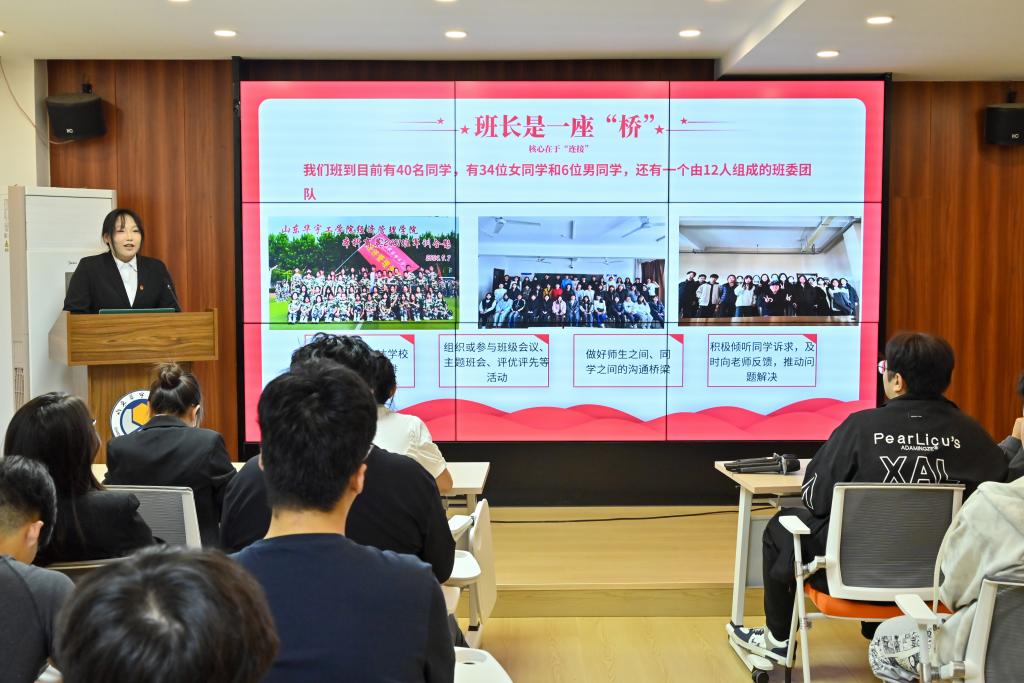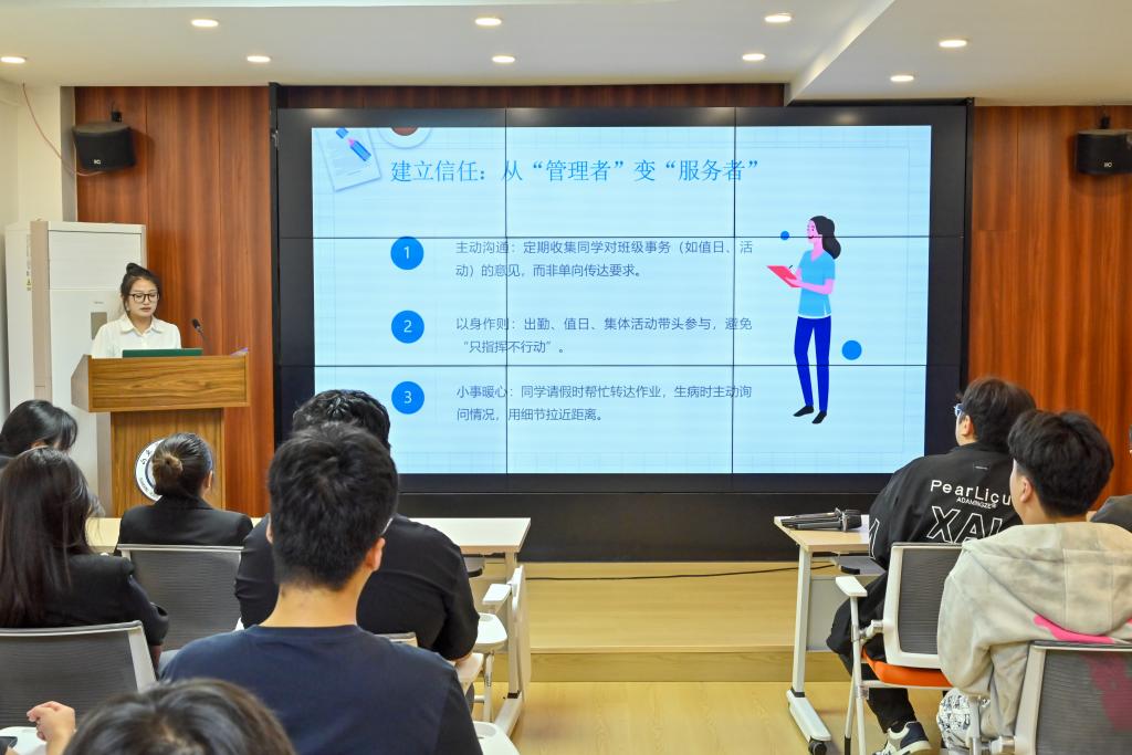 论坛交流环节中,三位优秀班长代表依次登台,分享班级建设的实践经验与创新思路。本科信管2302班乔雨桐以《共话成长,引领班级新征程》为题,结合班级在学风建设中的长效机制与文化培育举措,阐述如何以 “成长型思维“ 带动班级整体进步;本科财务2403班孙婧珊围绕《从陌生同学,到学习伙伴》,聚焦新生班级凝聚力构建,分享了通过主题班会、小组学习、集体实践等活动,打破同学间陌生感、打造互助学习共同体的具体做法;本科商英2401班张雅雯则以《连接・服务・成长:当好新时代的班级 “首席服务官”》为核心,提出班长应立足“服务者”定位,在连接同学需求与英国上市公司365资源、协调班级事务与个人发展中发挥桥梁作用,其理念引发在场班长的广泛共鸣。三位代表的分享紧扣班级管理痛点与学风建设重点,既有理论思考,又有实践案例,为在场班长提供了可借鉴、可复制的宝贵经验。